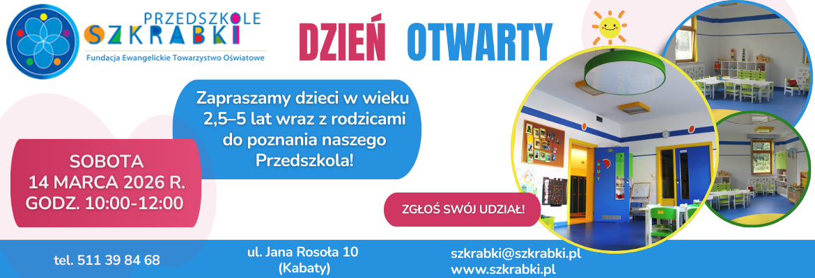 Serdecznie zapraszamy na dzień otwarty w Przedszkolu Szkrabki, który odbędzie się 📅 w sobotę, 14 marca 2026 r. 🕙 w godzinach 10:00–12:00. Na dzieci w wieku 2,5–5 lat czekać będzie mnóstwo atrakcji! W programie m.in.: wspólne zabawy, zajęcia plastyczne i ruchowe,...