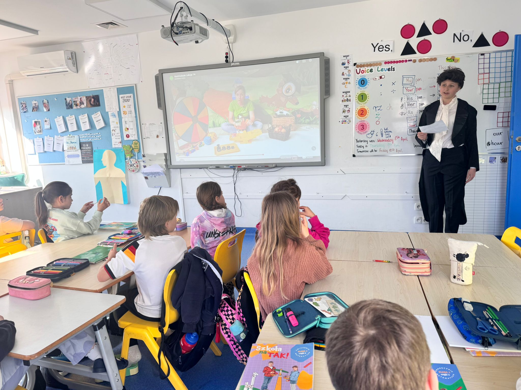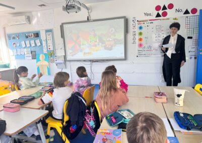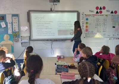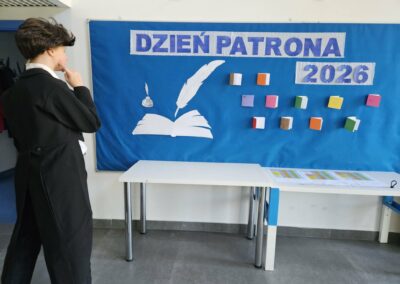 Uczennice i uczniowie klas 8 przygotowali prezentację o Patronie i z dużym zaangażowaniem przedstawili ją pierwszakom, przybliżając im jego życie i dokonania. Po prezentacji odbył się także quiz, który pozwolił sprawdzić zdobytą wiedzę i dostarczył wszystkim sporo emocji.