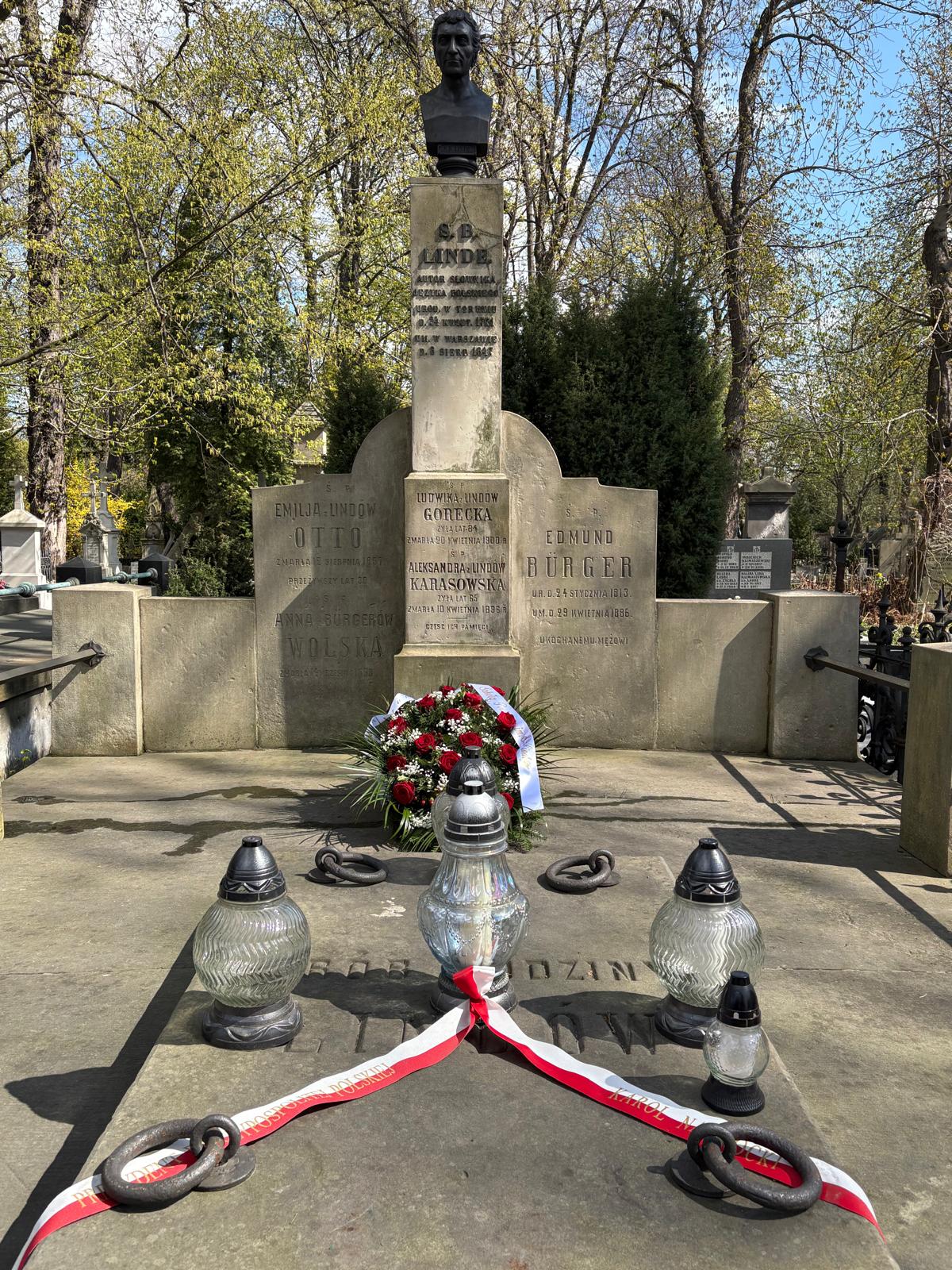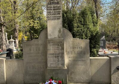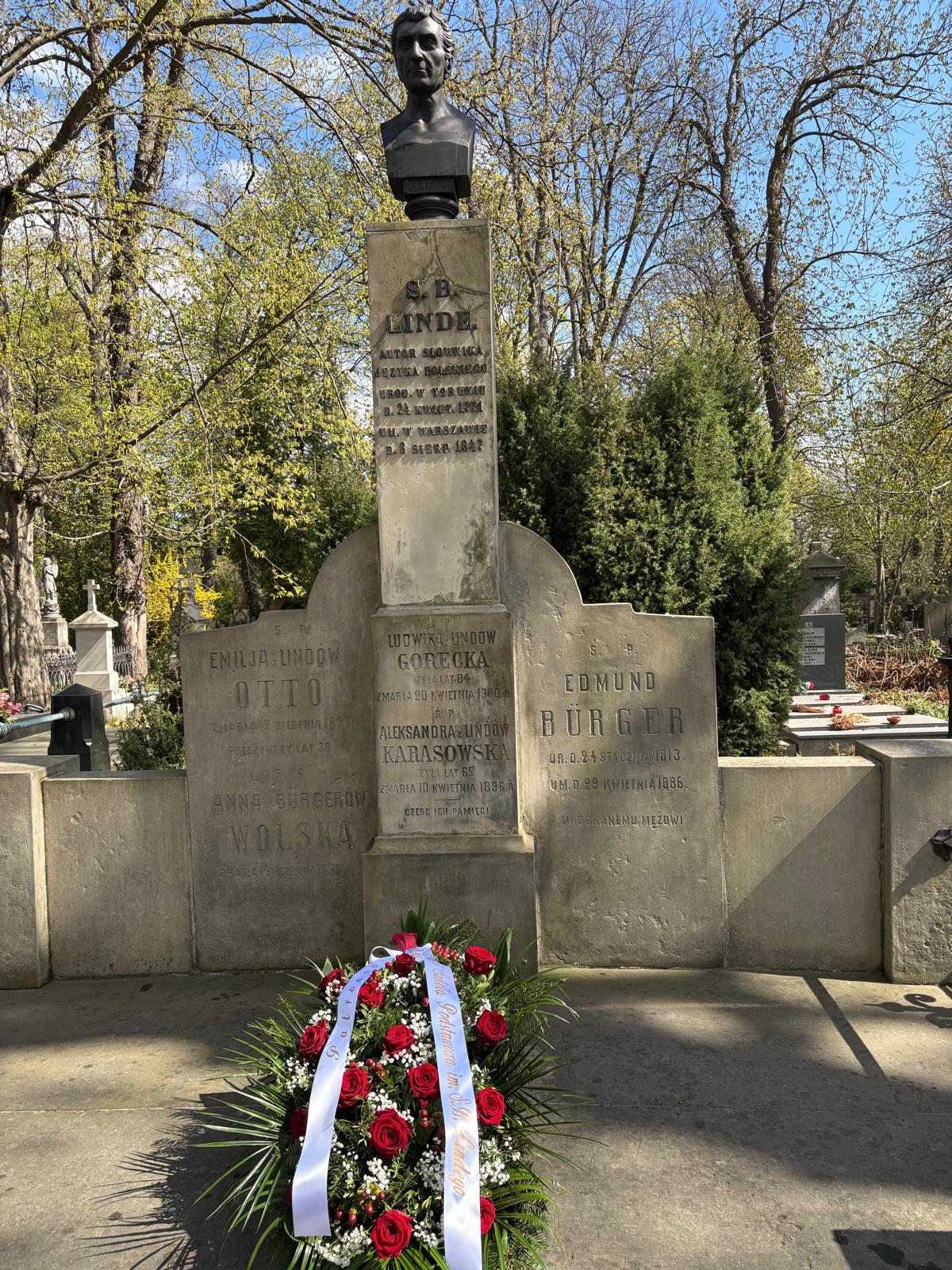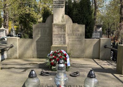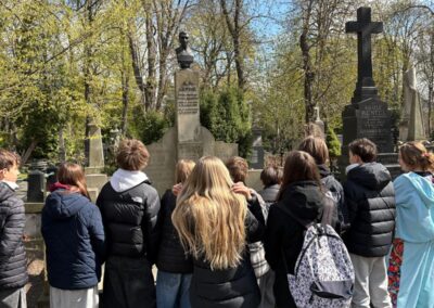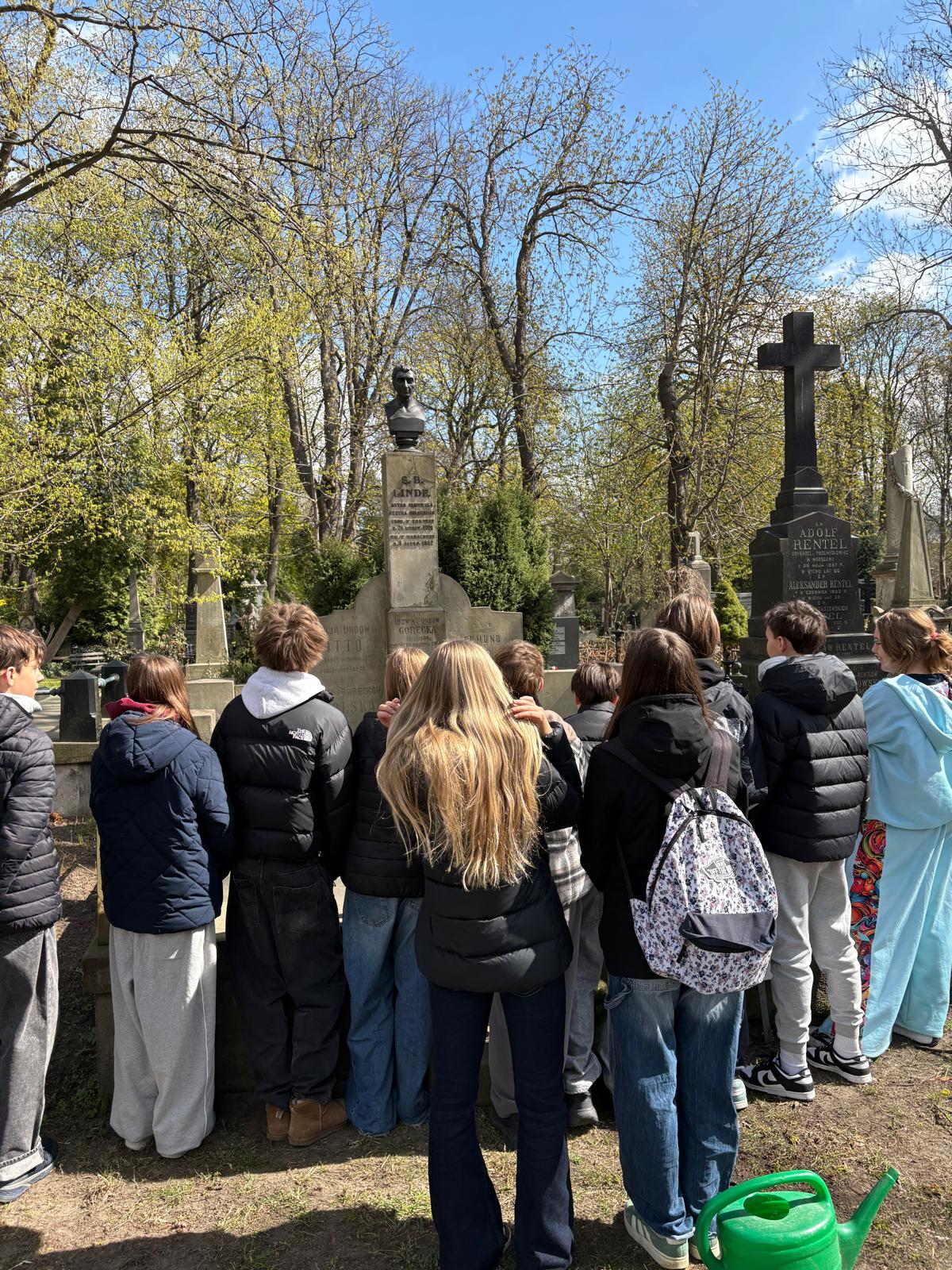 To jednak nie wszystko – Pani Prezes Agnieszka Bednarkiewicz-Sowińska i Pani Dyrektor Beata Wilkowska wraz z uczennicami i uczniami klasy 8c udały się na Cmentarz Ewangelicko-Augsburski przy ul. Młynarskiej 54/56/58, gdzie została złożona wiązanka na grobie Patrona, oddając hołd jego pamięci.